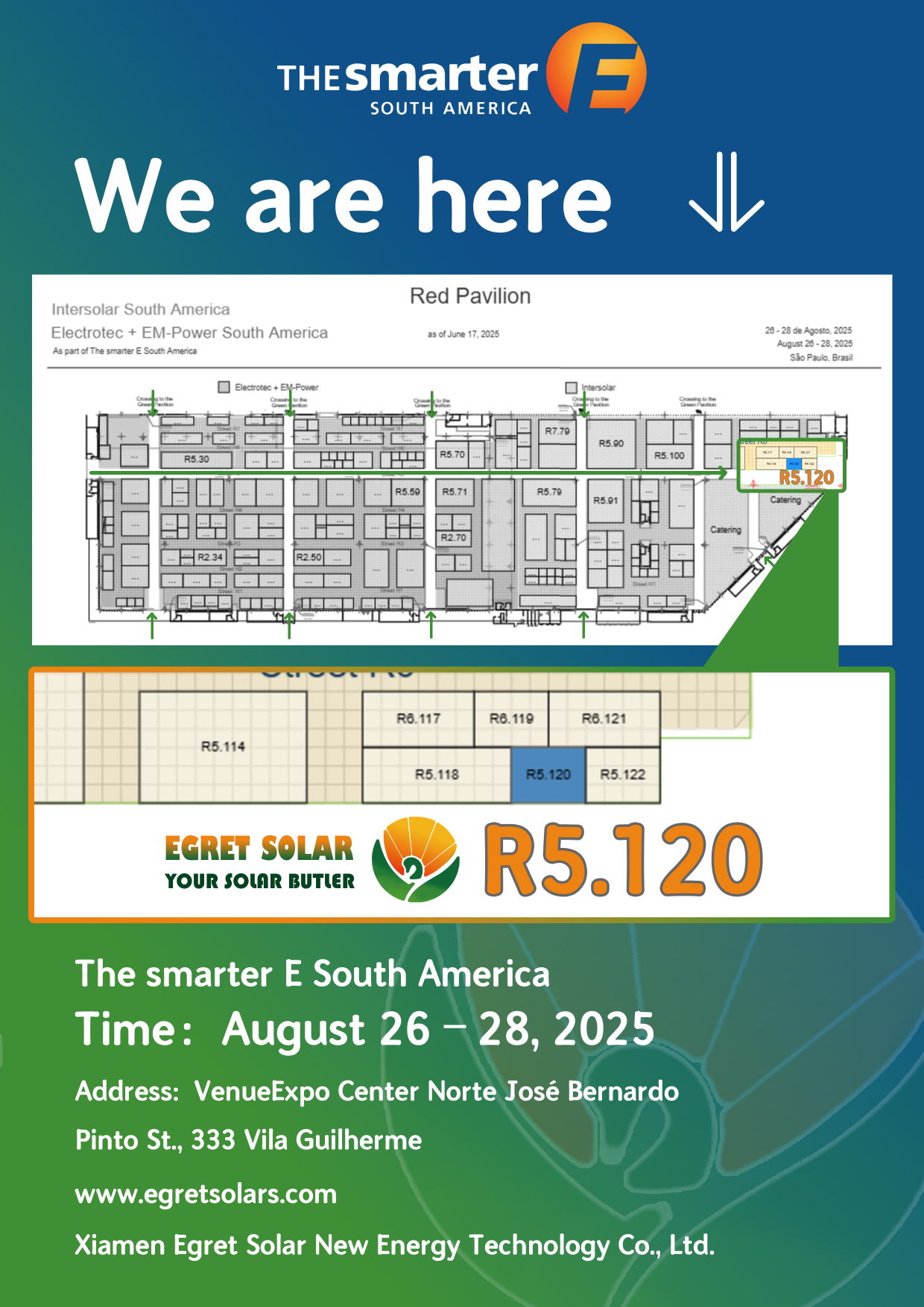 আরও পণ্যের বিশদ বা অ্যাপয়েন্টমেন্টের সময়সূচী করার জন্য, দয়া করে আমাদের অফিসিয়াল ওয়েবসাইট: www.egretsolars.com দেখুন। আমরা দক্ষিণ আমেরিকার নতুন শক্তির নীল মহাসাগর যৌথভাবে অন্বেষণ করতে স্মার্ট ই দক্ষিণ আমেরিকা 2025 এ সর্বস্তরের অংশীদারদের সাথে দেখা করার অপেক্ষায় রয়েছি!